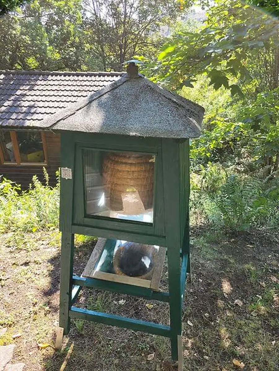 Der mit einem Bienenvolk besetzte Strohkorb an unserem Lehrbienenstand kann mithilfe eines untergelegten Spiegels direkt beobachtet werden und bietet so einen besonderen und unmittelbaren Einblick in das Volk.